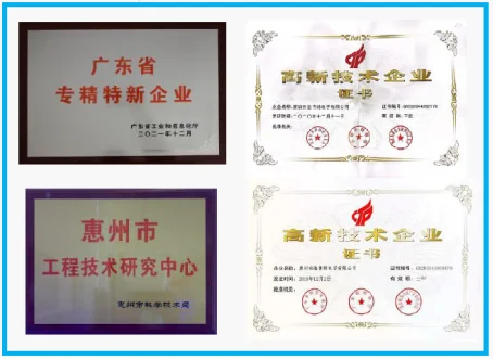 1、经过多年的沉淀,企业基础夯实,获得了各界的高度认可,获得了国家级高新技术企业、广东省“专精特新”认定企业、惠州市工程中心、两化融合体系认证企业、ISO9001(2015版)国际质量体系认证等。(附部分资质展示)