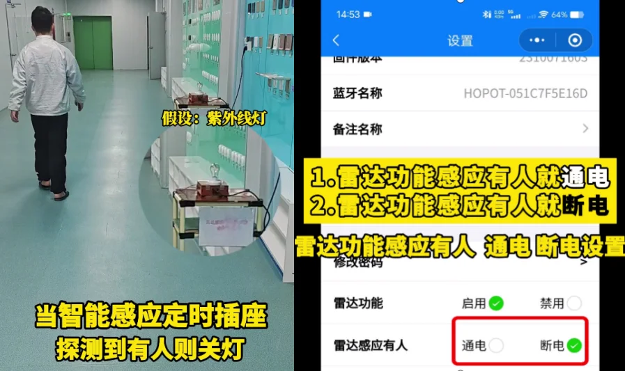 相较于传统的定时插座,浩博特公司的这款紫外线雷达感应插座不仅实现了基本的定时通断电功能,更加入了先进的人体存在感应技术。其独特之处在于,插座能够根据人体的存在状态实时调控电力供应,即雷达感应到有人在的时候插座自动断电,没有人的时候自动通电。有效避免紫外线对人体的潜在危害。这一创新设计不仅保持了定时通断的精确执行,同时将智能感应功能巧妙融合,为用户带来更为方便和安全的使用体验。