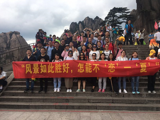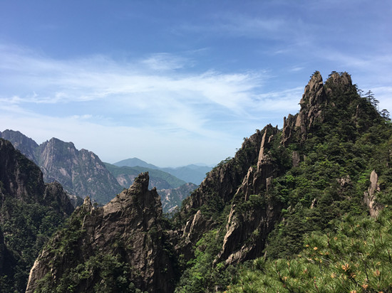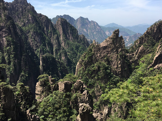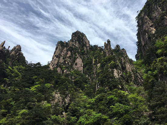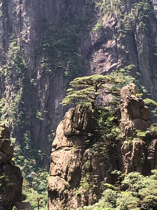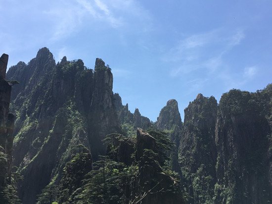 第二日的行程是此次活动的压轴“畅游峥嵘黄山”。前几日景区经过急风骤雨的洗礼,天空湛蓝,空气清新,地面一尘不染。黄山松更加苍翠,树木杂草郁郁葱葱,山花开的更加鲜艳,五颜六色。丛林中随处可见鸟儿欢快的呼叫声,到处是一派生机勃勃的景象。五月的黄山是百花齐放的季节,尤其是山崖上、岩壁下、松林间、游道旁,到处是杜鹃摇曳的身姿。红的像火、粉如霞、白似雪,在绿叶松树的衬托下显得越发娇艳欲滴,轻风过处,花影绰绰,如裙摆飘飘,美艳撩人。丝毫不输给十里桃林,仿佛自己已然成仙,忘记世俗。远眺怪石嶙峋,崖壁似削,危峰兀立,群山起伏,耸入云端。正是“薄海内外,无如徽之黄山。登黄山,天下无山,观止矣!”