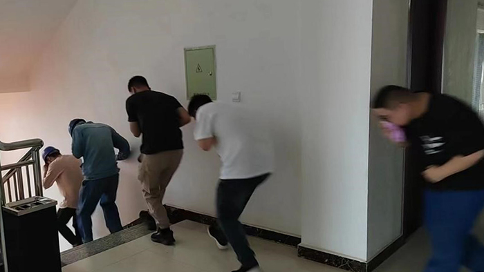 按照演习方案的要求,演习组织部门采用烟幕弹模拟火灾现场。当烟幕弹散发出浓烟时,设备检修组人员到化水配电室切断办公楼的电源;疏散引导组在楼梯口处引导办公室内的工作人员按照“捂鼻、弯腰、沿墙”的防护原则迅速撤离到安全地带;应急救援组组织义务消防队员打开消防箱、连接消防带、打开消防栓进行喷水灭火救援。参演人员动作标准、迅速果断,短时间内将火灾消灭在萌芽状态,保证了员工的生命财产安全。