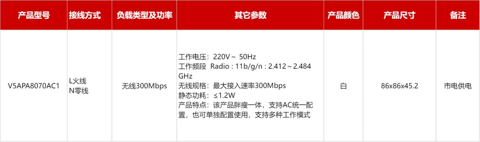 无线AP(市电供电)产品型号:V5APA8070AC1WH